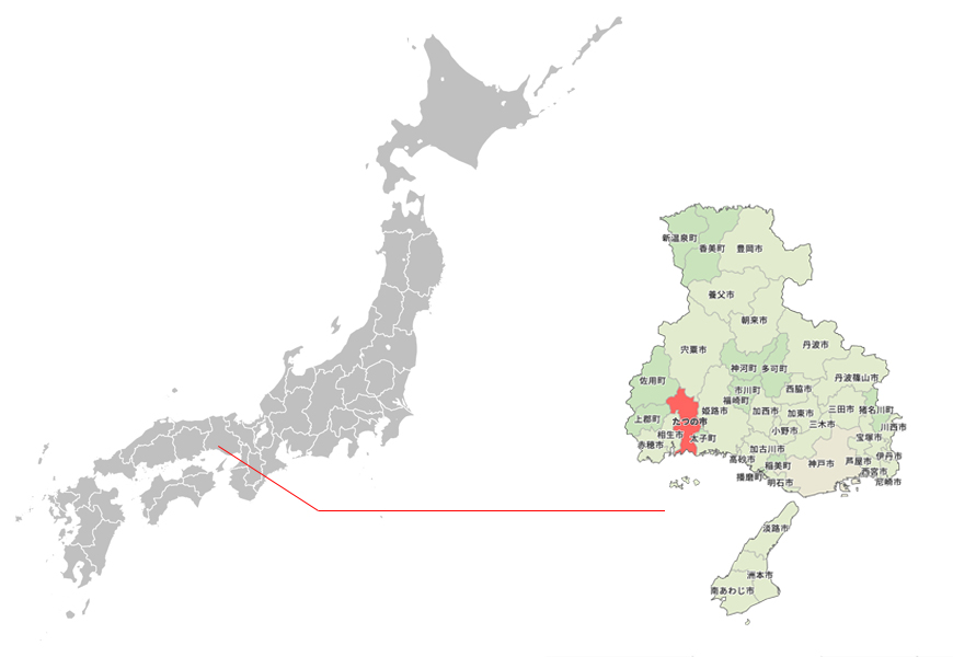 お車の場合はカーナビに「兵庫県たつの市龍野町宮脇144」または「前田産業株式会社」と入力してください。