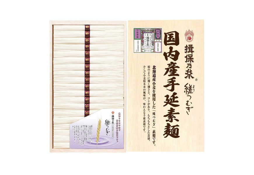 「揖保乃糸」の職人技の伝承を目的に誕生した、厚生労働省認定の国家資格である「手延製麺技能士」有資格者謹製の手延そうめんです。