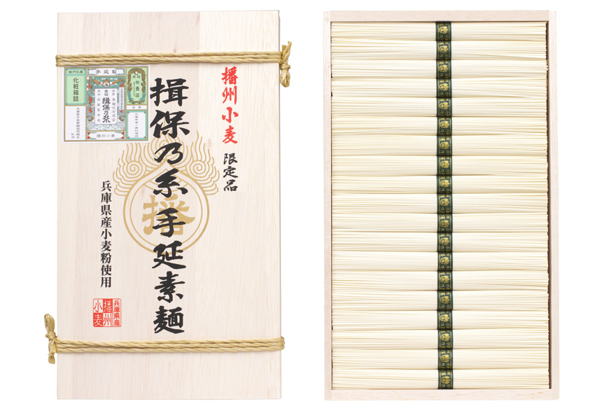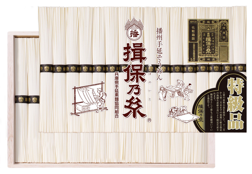 寒仕込みで丹念に仕上げた、揖保乃糸 特級品。繊細で上品な口あたりと、ほどよいコシが調和した特別な味わいです。
